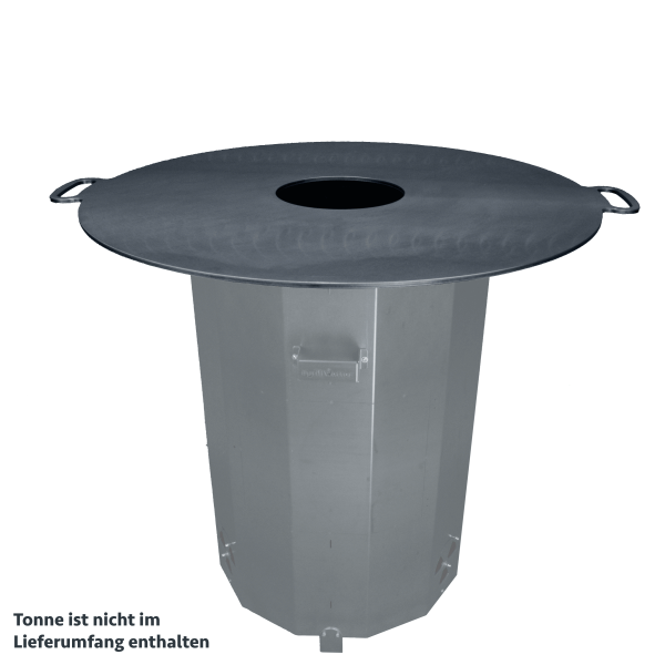 Wir verzichten bewusst auf werbewirksame Logos innerhalb des Plattendurchmessers und haben die Griffe nach außen verlegt. Der Ausschnitt mit einem Innendurchmesser von 25 cm ist das Optimum zwischen maximierter Grillfläche, Hitzeeinleitung in die Platte und Nutzung direkter Hitze über der Öffnung zum Spießgrillen, Wokken und Finishen Deiner Lieblings-Cuts.